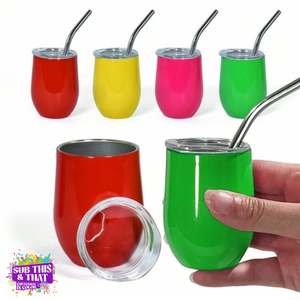 Bright, bold, and totally customizable! Our 3oz Sublimation Mini Neon Wine Tumbler Shot Glass combines fun size with serious style. Designed in the popular wine tumbler shape, this mini cup is perfect for personalized party favors, espresso shots, or unique gift sets. With a vibrant neon finish, sublimation-ready coating, and included metal straw, it’s a tiny tumbler with major impact!