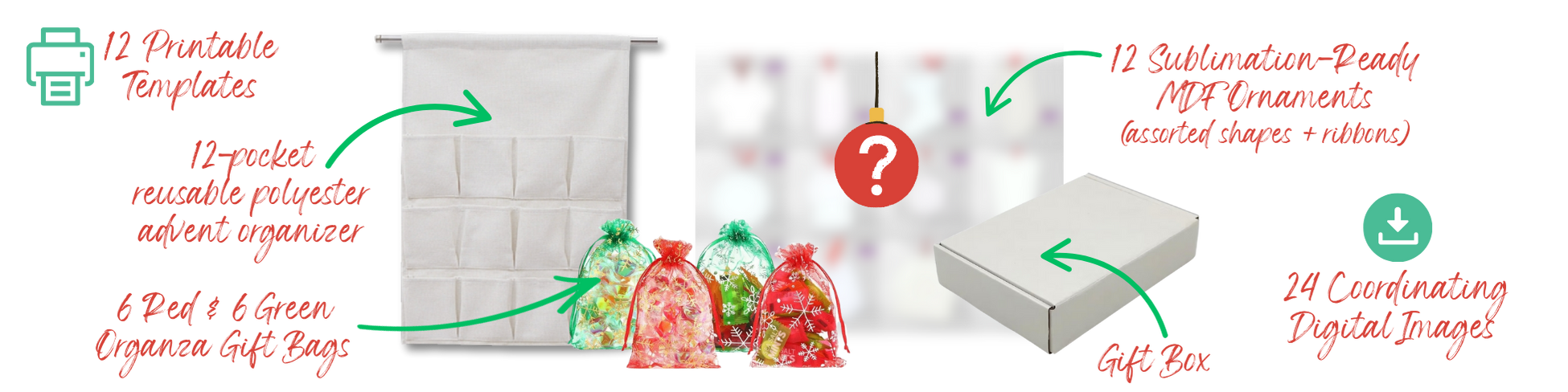 - 12 Mystery Sublimation MDF Ornaments – A surprise blank behind each pocket — new shapes, styles, and inspiration!